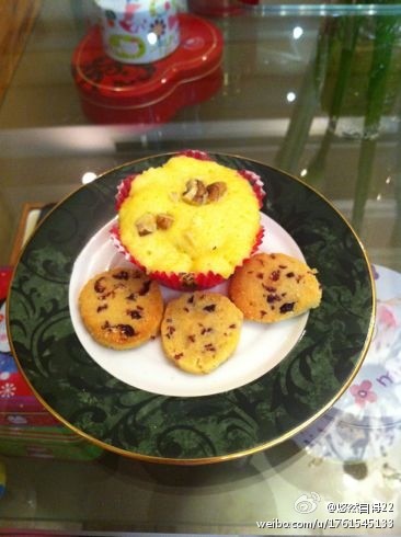 饼干里面放的蔓越莓,蛋糕里面放的核桃,同事给我吃了点,可香了,嘻嘻